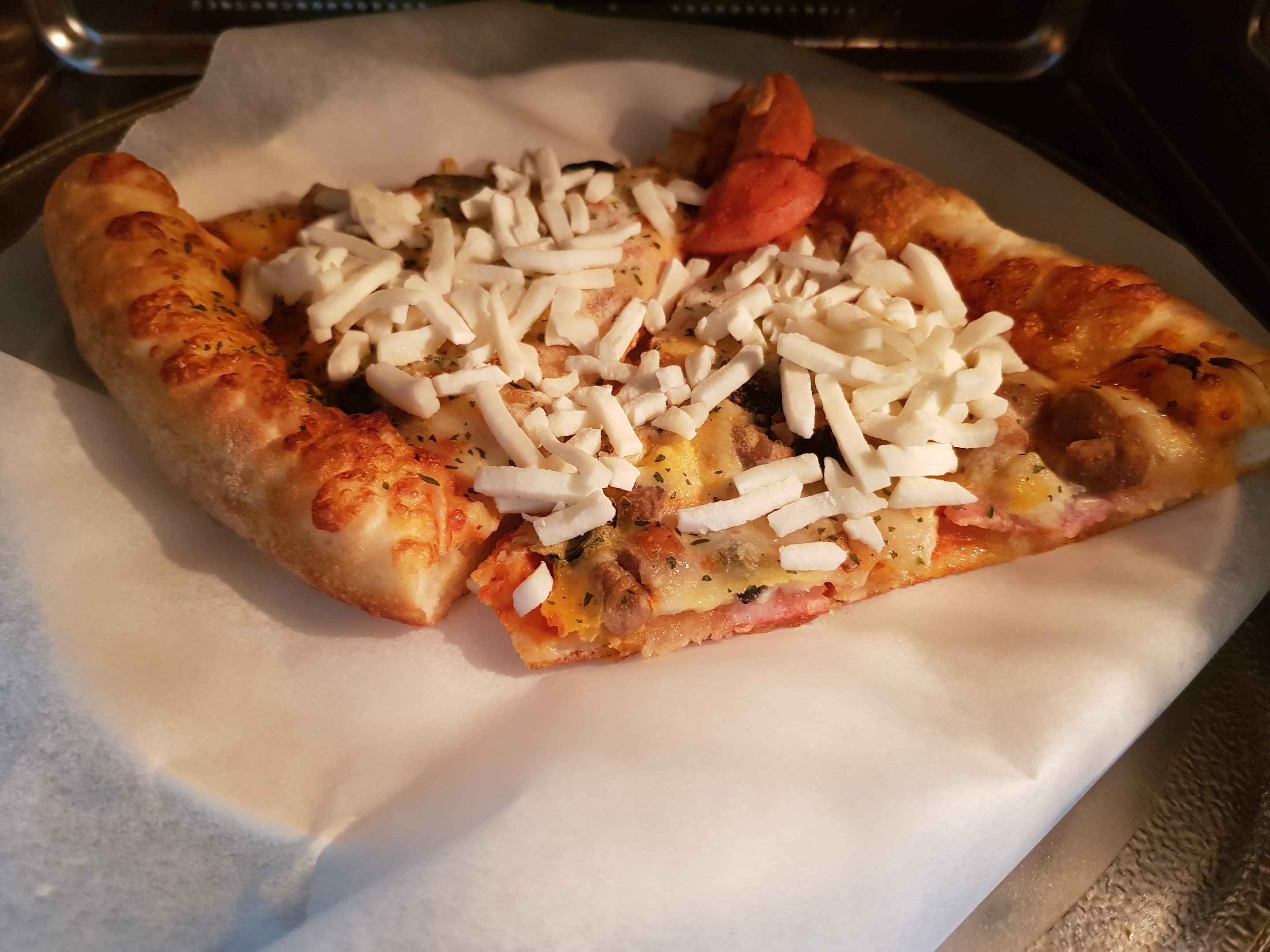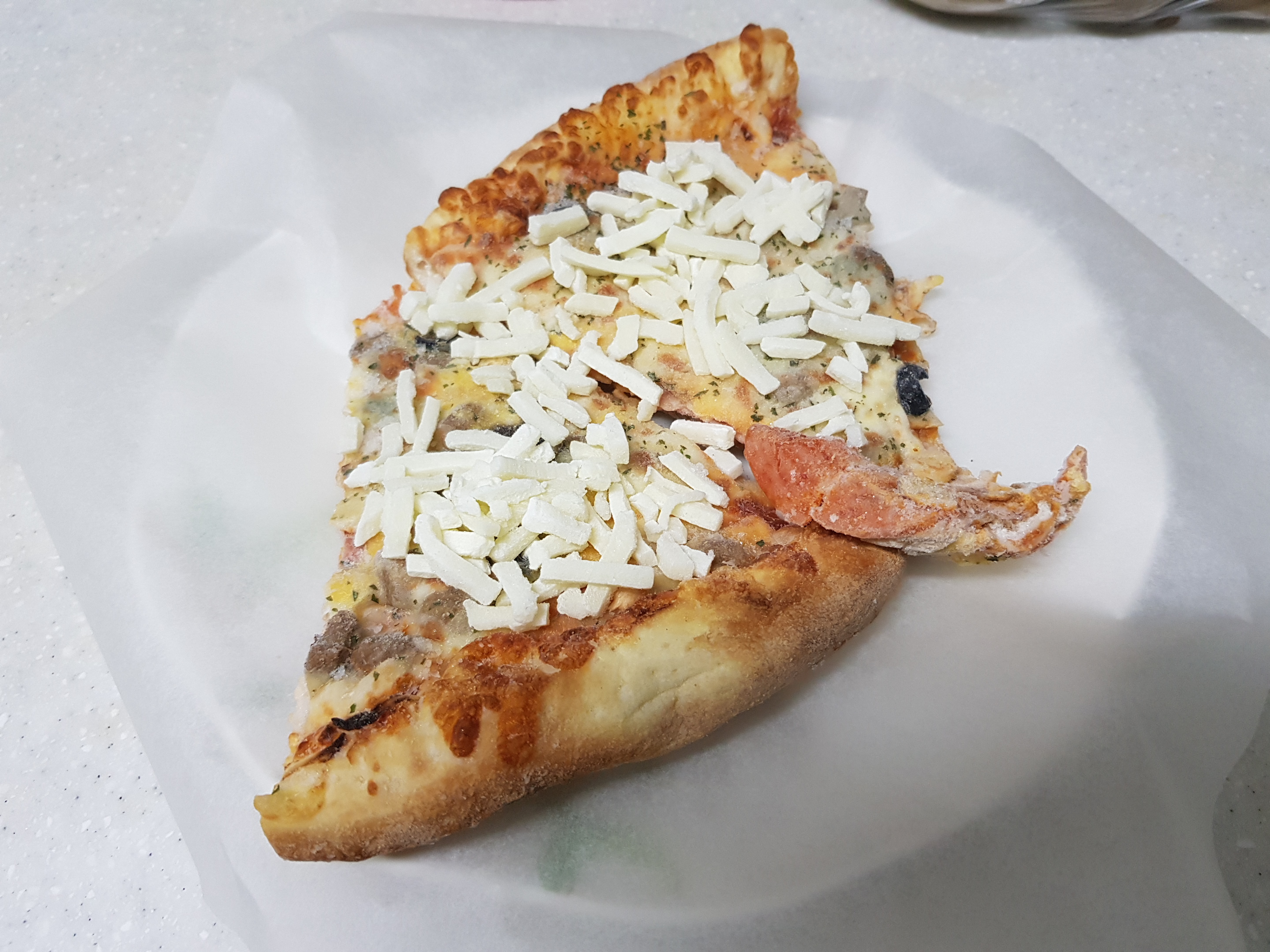 그리고 이렇게 자체적으로 치즈 토핑을 추가해준다. 이 것은 일반 냉동피자를 조리할 때 유용한 방법이다. 가성비 제품이므로 치즈가 원하는 만큼 충분하지 못할 경우가 많기 때문이다.