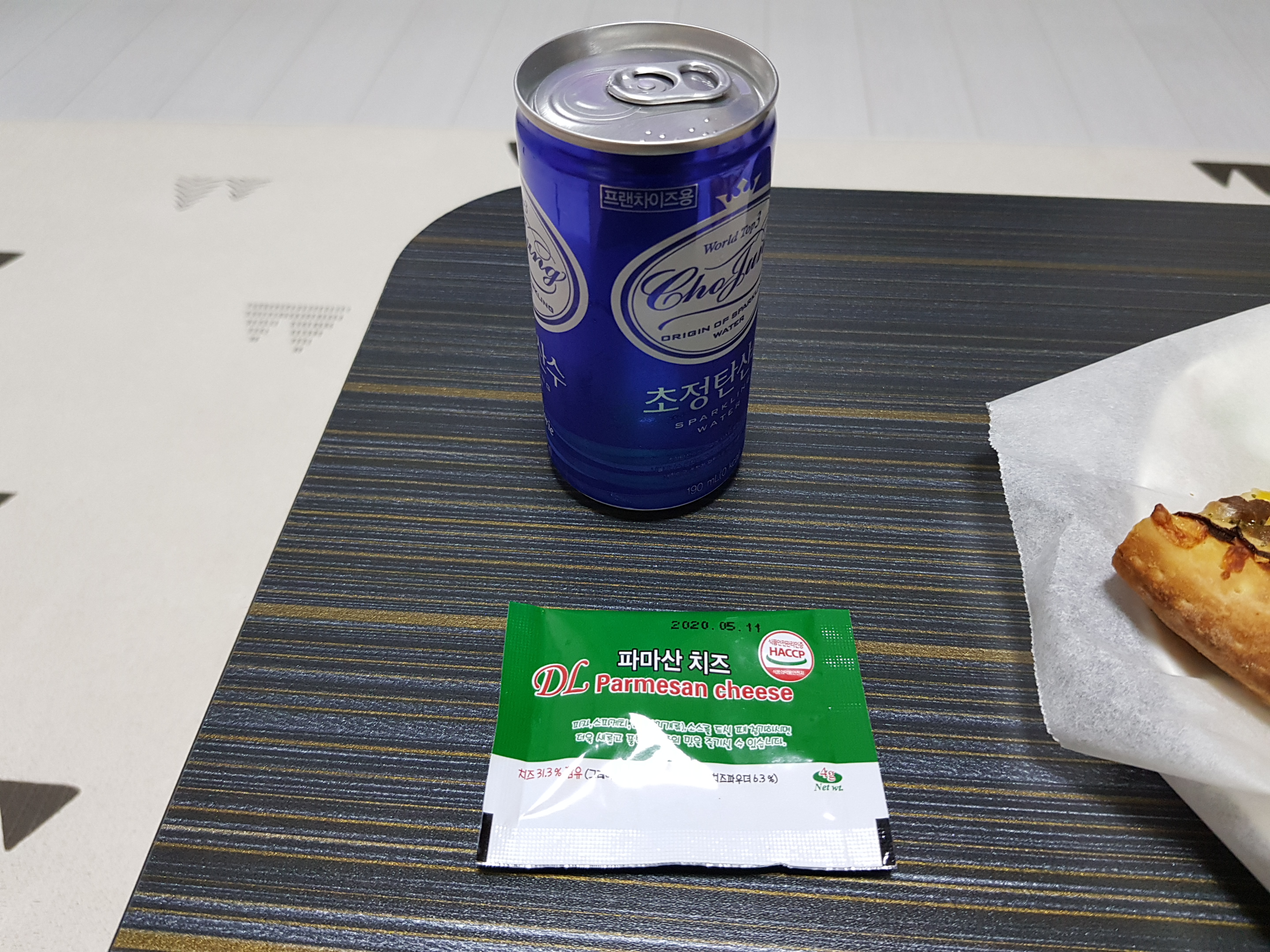 피자에는 탄산! 사이다나 콜라를 먹으면 좋겠지만, 당을 많이 섭취하는 것을 막고자 탄산수를 먹었다. (그러면서 나트륨 가득한 피자는 마구 먹는다. 파마산 치즈까지 뿌려서)
