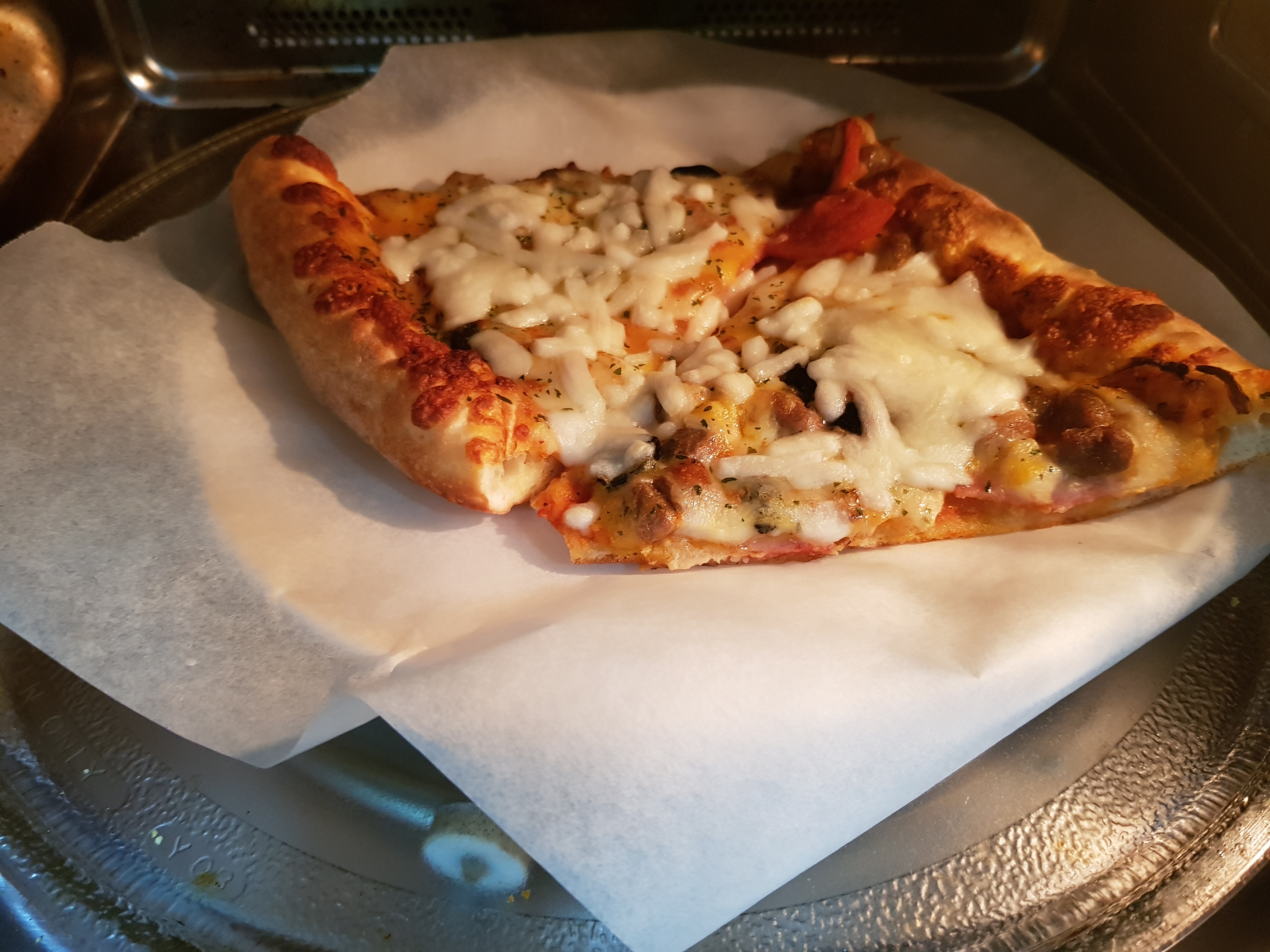 컵에 약간의 물을 담아서 같이 돌리면 물이 증발하면서 전자레인지 안에 수분이 생기고 그게 피자가 딱딱해지는 것을 방지한다는 원리다. 하지만, 딱히 크게 도움이 되는 느낌은 아니었다.