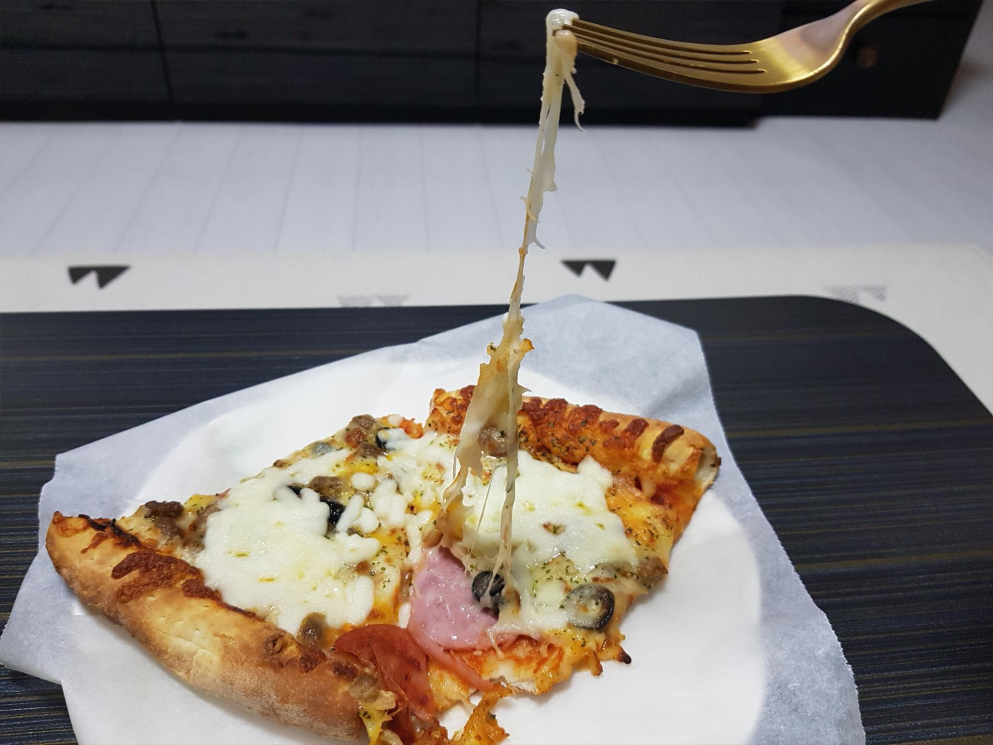 이렇게 쭈우우욱 잘 늘어난다. 맛도 좋다. 수분감도 살아있고 도우가 많이 딱딱해지지도 않았다.